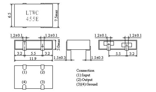 陶瓷濾波器,貼片陶瓷晶振,LTWC455E,千赫茲壓電陶瓷貼片型產品,一般電子產品用標準頻率公差型,利用本公司獨創的封裝技術,實現了千赫頻率陶瓷濾波器,貼片陶瓷濾波器體積小,只有4.0mm max.厚度,且有更小的貼裝面積,方便 PCB 彈性設計,有多種帶寬可供選擇,組件可用自動機貼裝,可用波峰焊,耐水洗,并且此濾波器可以與村田晶振CFUCG 系列相容,此種新式濾波器結構可以更完美的安裝在可移動的通訊產品中,如手機,袖珍型呼叫器等消費類電子產品.