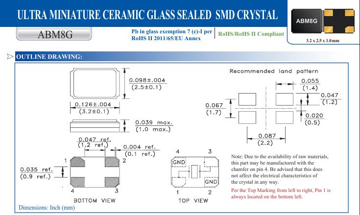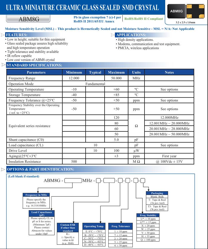 | ABM8G-25.000MHZ-B4Y-T | Abracon LLC | ABM8G | MHz Crystal | 25MHz | 4-SMD, No Lead | 0.126" L x 0.098" W (3.20mm x 2.50mm) | 0.039" (1.00mm) |