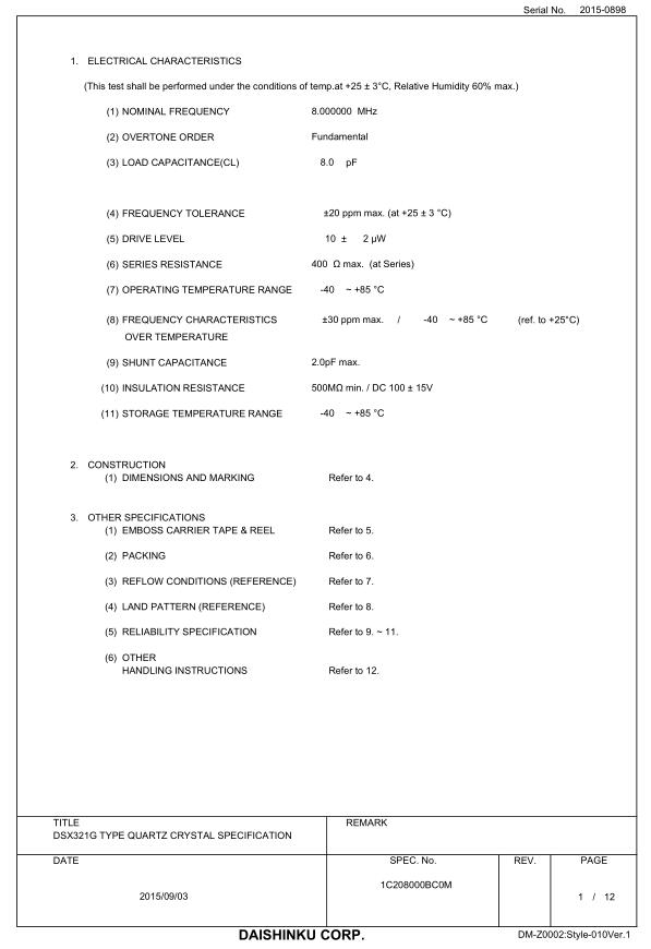 1C208000BC0M DSX321G 8M 8PF 20PP KDS陶瓷黑色晶振