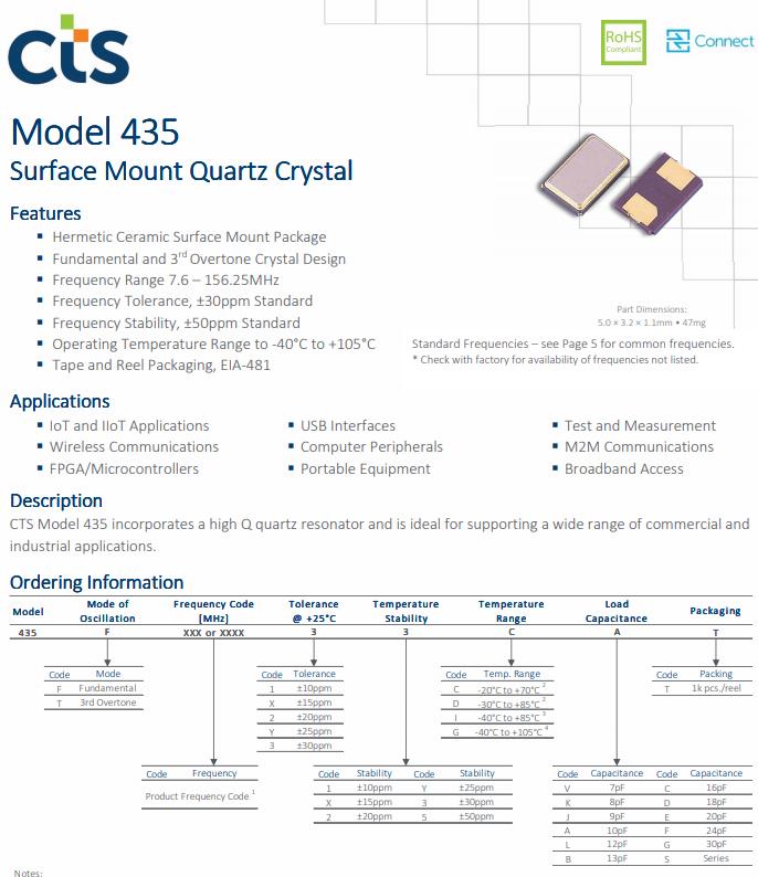 CTS晶振公司推出的435型的標準產品特性和常見市場應用總結如下。