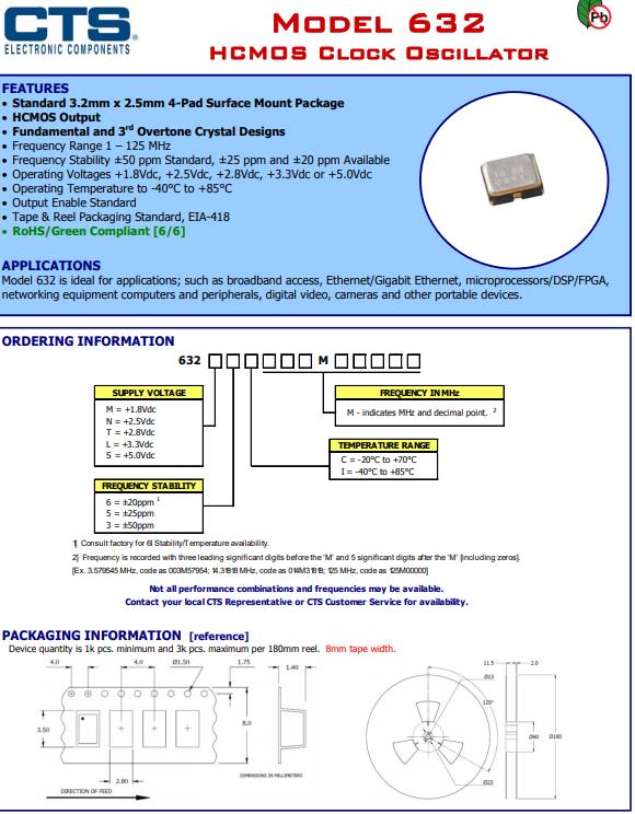 | 632L3I008M00000 | CTS-Frequency Controls | 632 | 8MHz | ±50ppm | 0.126" L x 0.098" W (3.20mm x 2.50mm) |