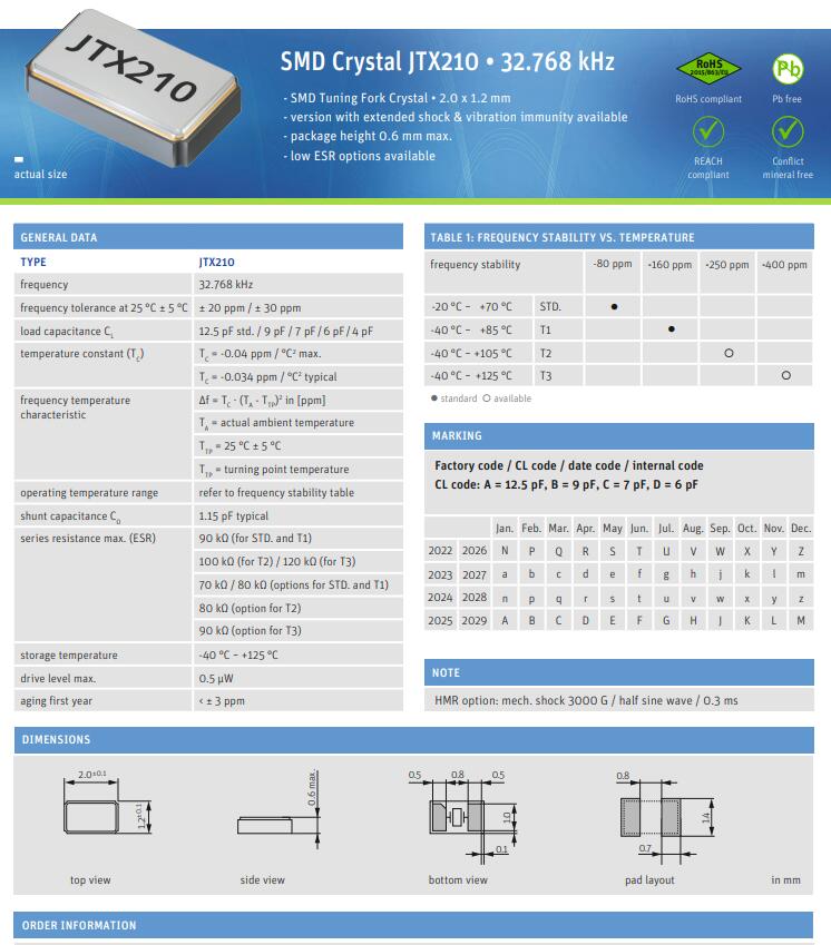 | Q 0.032768-JTX210-12.5-20-T3-LF | Jauch Quartz | JTX210 | 32.768kHz | ±20ppm | 12.5pF | -40°C ~ 125°C | 2 | (2.00mm x 1.20mm) |